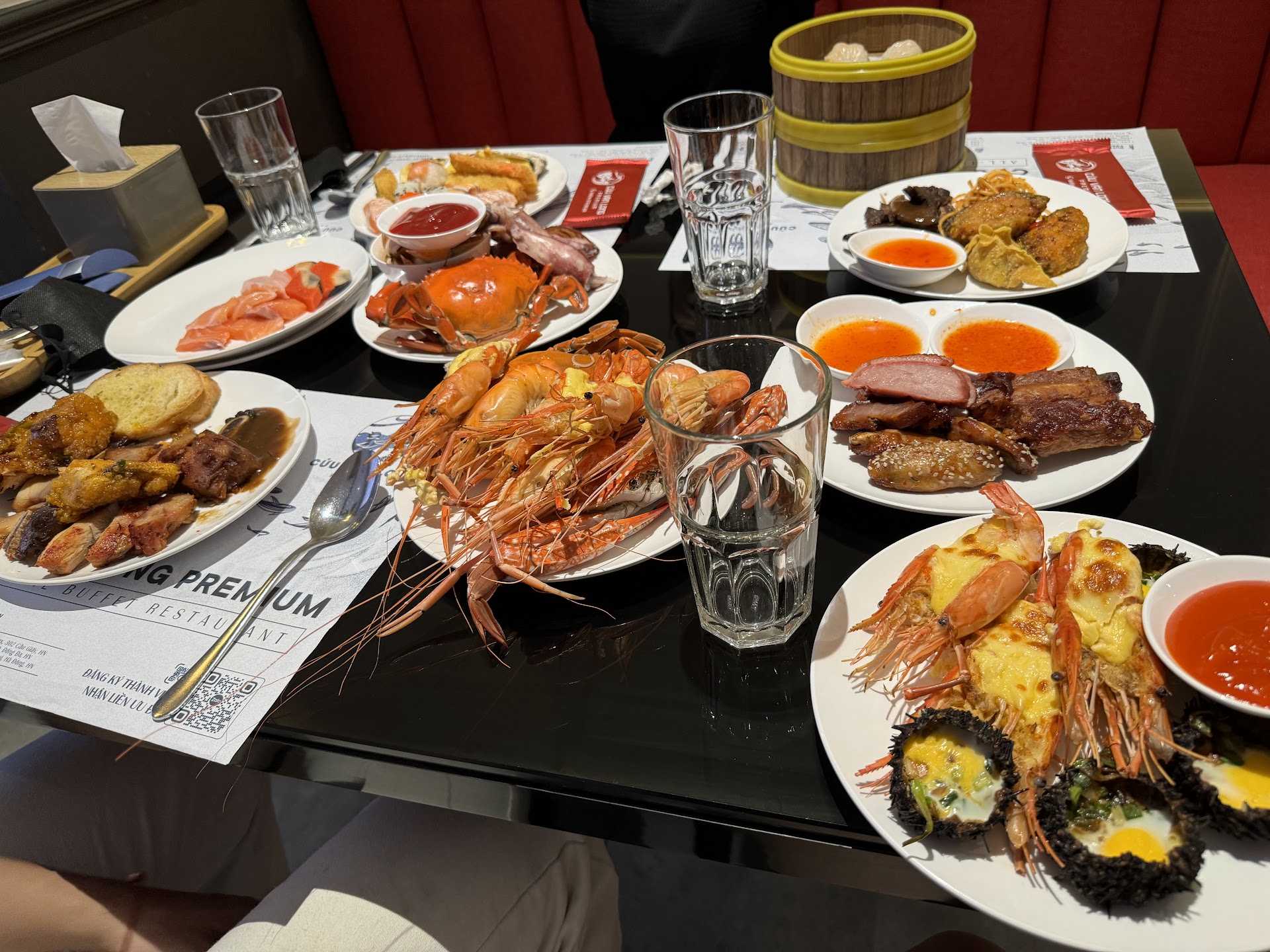 Buffet Cửu Vân Long Premium isn’t just a meal, it’s a well-oiled culinary experience, a place where the chaos of a bustling buffet meets the polish of fine dining. From the moment we sat down, the service was flawless, something you’d expect at a 5-star restaurant. The waitstaff operated like a well-rehearsed orchestra, one clearing our plates just as another replaced them, keeping our table clean despite the endless stream of crab shells, snail shells, and oyster remnants. Even during peak hours, the front staff managed the crowd with precision, making sure no guest felt overlooked. Impressive.