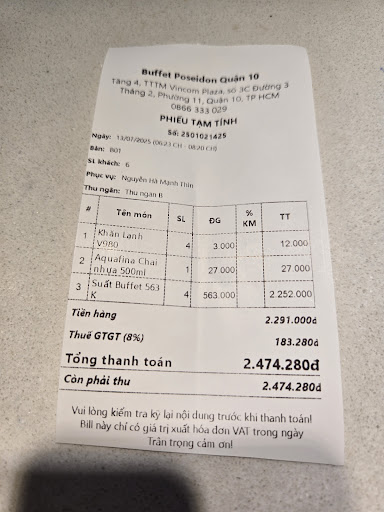Read morePoseidon Buffet at Vincom Plaza is truly AYCE seafood heaven! They have everything—from oysters, mussels, crab, lobster, and salmon to a hotpot (lau) station! There’s so much variety, and the abalone is so popular that people were camping out for it. The dessert selection is excellent, and I loved the make-your-own dipping sauce station. Each table has trash buckets for shells, which is super convenient. The servers are quick, attentive, and clear plates immediately, making for a smooth dining experience. Plus, there’s no time limit, so you can enjoy it all at your own pace. Highly recommend reserving online or coming right at opening time to...