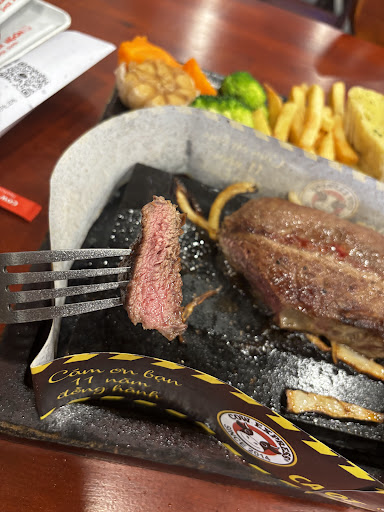 Read moreMình tới vào trưa t2, khoảng 12h, giờ này thì vắng không đông. Mình gọi Mojito việt quất. Món này RẤT NGỌT, mình có càm giác như uống nước đường ấy, không thấy mùi việt quất, không thấy ga, cứ như là rót lon soda còn dở vào ấy. 2 món bò mình gọi là Bò lúc lắc khoai tây và set Hot stone hunter bò hokube ribeye. Bò lúc lắc làm vừa mềm, ngon. Riêng set bò thì loại hokube có vân mỡ ăn sẽ mềm hơn, bò được để trên đá nướng nên order tái rồi đặt chờ đá nguội là vừa chín mà còn mềm. Salad ăn kèm ngon, nhưng mà miếng to quá, nêncắt miếng nhỏ vừa ăn chứ để miếng to lấy ra cũng rơi rớt tùm lum á. Hôm nay mình có đăng ký thành viên, trên menu ghi là đăng ký thành viên mới được tặng 1 nước ngọt hoặc nước suối. Mình đi 2 người nghĩa là được tặng 2 phần tuy nhiên bên quán nói 1 hóa đơn cho chỉ được áp dụng cho 1 voucher. Mình không hiểu đăng ký thành viên thì liên quan gì đến voucher vì trên menu ghi đăng ký thành viên mới là được tặng và có hỏi lại fanpage thì bên đó nói rằng 2 người đăng ký thì được tặng 2 phần kể cả 1 hóa đơn. Bạn phục vụ có nói lại cho mình tất cả các chi nhánh đều chỉ áp dụng tặng 1 phần cho 1 hóa đơn nhưng nếu fanpage bảo như vậy nghĩa là quán sẽ tặng mình 2 phần :))) Lúc nhận hóa đơn thì mình có thấy ghi mã giảm giá và xác nhận lại là đăng ký thành viên thì sẽ có 1 mã voucher tặng nước ngọt hoặc nước suối cho nên chỉ áp 1 voucher cho 1 hóa đơn. Quán nên làm việc lại với nhân viên để giải thích hợp lý hơn, ghi lại trên menu rõ ràng hoặc gửi voucher qua zalo lúc đăng ký luôn đi chứ để như vậy rất dễ...