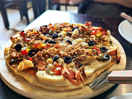 Yeah with a name like this - the place is best to be avoided. It does look filthy, so it probably is and a restaurant should be committed to serve clean food to the public in a clean environment - end of story. No, I'll say more: I normally don't care what kind of gimmick is used to attract customers, but this one didn't work for me. I went into the bathroom before I ordered, and it was borderline disgusting. I should have walked out without ordering. The half Mexican, half something unmemorable pizza was edible but mediocre at best. And if they clean the kitchen as well as they clean the bathroom - I'm screwed. I just started on this path moving towards veganism - I'm doing it one day a week. I won't come here again on my journey to a healthy old age. I mean there is a lot on the menu to choose from, but I had the notion it was predominantly processed food. Nothing really fresh. I guess if you want vegan pizza or taco or hamburger etc, you're not gonna get it made with fresh vegetables. This might be the reason why the owner, who was very friendly and told me he has been a vegan for 19 years, doesn't have the girth associated with a person who abstains from...