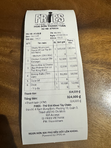 I recently visited Mrs. Fries Vietnam with high expectations, but unfortunately, my experience was underwhelming. The fries, which should be the highlight, were disappointingly soggy and lacked the crispiness you’d expect from a place that specializes in fries. It felt as though they weren’t cooked to the right standard or had been sitting too long before serving.