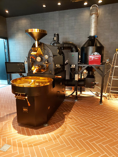 Inside and outside seating with a coffee roasting machine right next to the counter for customers to experience.