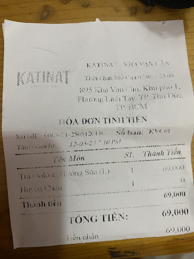 Read moreĐợi nước lâu, mình order trà sữa olong nước có bánh flan+ phô mai jumball+ phô mai dẻo, lấy nước xong mình đem về thì có mỗi cái bánh flan!!! Ly trà sữa 100k mà có mỗi cái bánh flan xem có bực mình không? Mà đây không phải 1 lần, đã nhất nhiều lần mình order Katinat ở nhiều chi nhánh khác nhau mà kết quả đều như nhau, mình gọi để phản ánh thì quán có kêu ship sang cho mình, đợi chắc cả tháng vẫn chưa thấy ship :)) được vote 1 sao là còn...