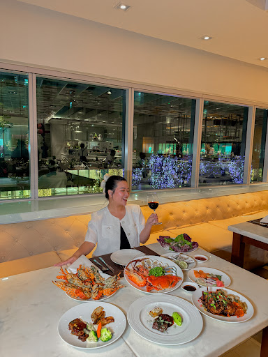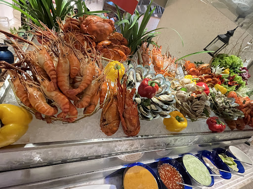 Ngay trung tâm nhà hàng là quầy line hải sản hấp dẫn với tôm hùm, cua, tôm càng, nghêu, vẹm, ốc Bulot… chế biến đa dạng: hấp, luộc, nướng mỡ hành, bơ tỏi, phô mai, hay sốt me. Bên cạnh là quầy sashimi, với cá hồi, cá ngừ, bạch tuộc, và các loại sushi như nigiri, maki.
