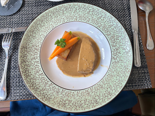 I started with the Creamy Corn Soup (SOUPE DE MAÏS CRÉMEUSE), which was rich and flavorful, with perfectly pan-seared chicken and a drizzle of olive oil. For the main course, I chose the Grilled Sea bass (BAR GRILLÉ), which was tender and well-cooked, served with potato brandade, fresh romaine lettuce, and a delicious seafood sauce. There’s also an option to upgrade to Iberico Pork for an additional VND 150,000, which I might try next time.