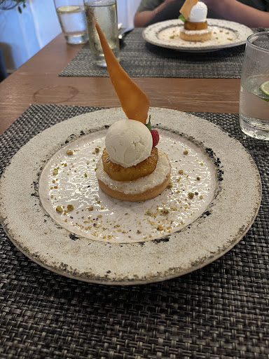 Dessert was a Pineapple Rice Pudding Tartlet (TARTELETTES ANANAS RIZ AU LAIT) that was light and satisfying, accompanied by a crunchy almond tuile and creamy vanilla ice cream—a perfect way to finish the meal.