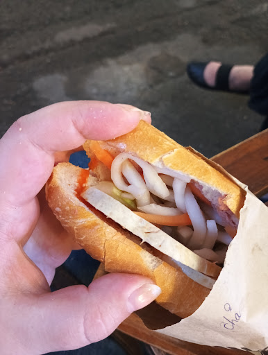 Genuinely kind and enthusiastic service. The waitress was even singing to herself as she works which is so nice to see. The banh mi was good. We tried the egg one and the grilled pork one. The grilled pork was more of a liver sausage which was delicious and perfect for me, even though it's not really grilled pork like the menu said. My complaint is that there was not enough meat in the pork sandwich. Mostly vegetables. The bread was also a tad too crunchy so the roof of my mouth and corners of my lips are a bit raw now. Each banh mi was 45k and we got the cheapest drinks on the menu: a fresh coconut for 30k each. I gave 3 stars for the atmosphere because there were sooo many street peddlars trying to sell us the same few items over and over ("special" lighters and hand fans) as we sat at the outdoor table. Even the same peddlars came up to us more than once and they will keep soliciting you despite you saying...