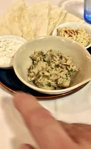 I arrived for dinner after a long work day. I ordered hummus w/baba ghanoush & pita, bottle of Panna still water and glass of white wine from Portugal. I had requested a double portion of Taziki on the side. I told the waitress to charge me for it, I’m happy to pay extra. The waitress was lovely and said “Sir you don’t have to pay for that”. The bar staff was attentive, your restaurant is clean and has a pleasant atmosphere. My wine was nice and I was feeling comfortable. Then my appetizer arrived. The pita was raw undercooked and tasted doughy. The hummus & bab ganoush was nice, Taziki was warm and watery, just way too thin, kind of tasty but missing several ingredients. I now know why the waitress didn’t want to charge me for the Taziki, they only gave a tablespoon full.