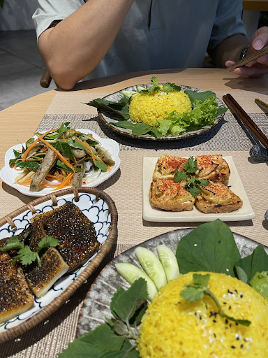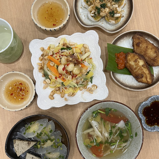 Absolutely enjoy the time here. Great service from the moment I walked in, staff were very gentle and helpful. The place looks really decent with great lighting, the greens, and neat interior. They have either buffet or a la carte. I ordered buffet pax for 130k-150k VND per pax. They change the menu everyday so depending on which day you come, there's another variety of options. But overall they'll structure the menu as a Vietnamese family meal with light hearty soup, different types of "bánh", and fresh rolls as appetizers, then rice and the main protein dishes ranging from stir-fried veggies to steamed tofu. Any dish you'd love to have more, you can order more without any limit :p. The food was fresh and well seasoned. Everything to the table was still hot....