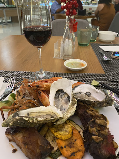 This was our second visit to this hotel and the first time we had the dinner buffet. Luckily we came on a Sunday evening and they had their featured seafood buffet and for guests staying at the hotel it was 50% off. My wife and I had an incredible feast of oysters, lobster, shrimp, crab, and shells. On top of that, there was a variety of salads, cheeses, Parma ham, soups, steak, pork, ribs, and several other items. I also had the unlimited wine for 180,000 which was a very good deal. The weight staff were incredible, my hat is off to Trí, Lần,...