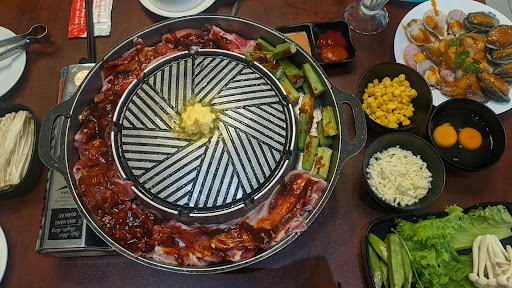 Món ăn ( 8,5/10 ) : Mình đi 3 người, chọn menu nướng 199k bao gồm đầy đủ thịt, hải sản. Thịt steak bò mỹ tẩm ướp ngon, thịt tươi ngọt. Hải sản như mực và tôm ở mức ổn, khá tươi. Nước uống vô cùng rẻ, 20k/pepsi và 15k/nước suối. Tráng miện bao gồm kem, flan và rau câu - kem ngon, những món còn lại ổn. Dịch vụ và phục vụ ( 10/10 ) : Đây là điều mình bất ngờ và vô cùng hài lòng. Nhân viên ở đây rất nhiệt tình, lên món rất nhanh - khác hẳn với kiểu câu giờ của các chuỗi buffet thường thấy. Bạn nhân viên hỗ trợ nướng và chỉ bọn mình cách nướng. Vì không có tiền mặt nên không thể tips cho bạn, đây là điều mình thấy hối hận. Không gian ( 7,5/10 ): Nhìn chung không gian rộng, chỗ để xe máy thoải mái ( ô tô thì chưa biết ). Không gian bên trong ở mức ổn, bày trí quầy lite foods dễ lấy, ghế ngồi thoải mái, mát và không quá hôi mùi khói. Chẳng đòi hỏi gì ở mức giá thế này.