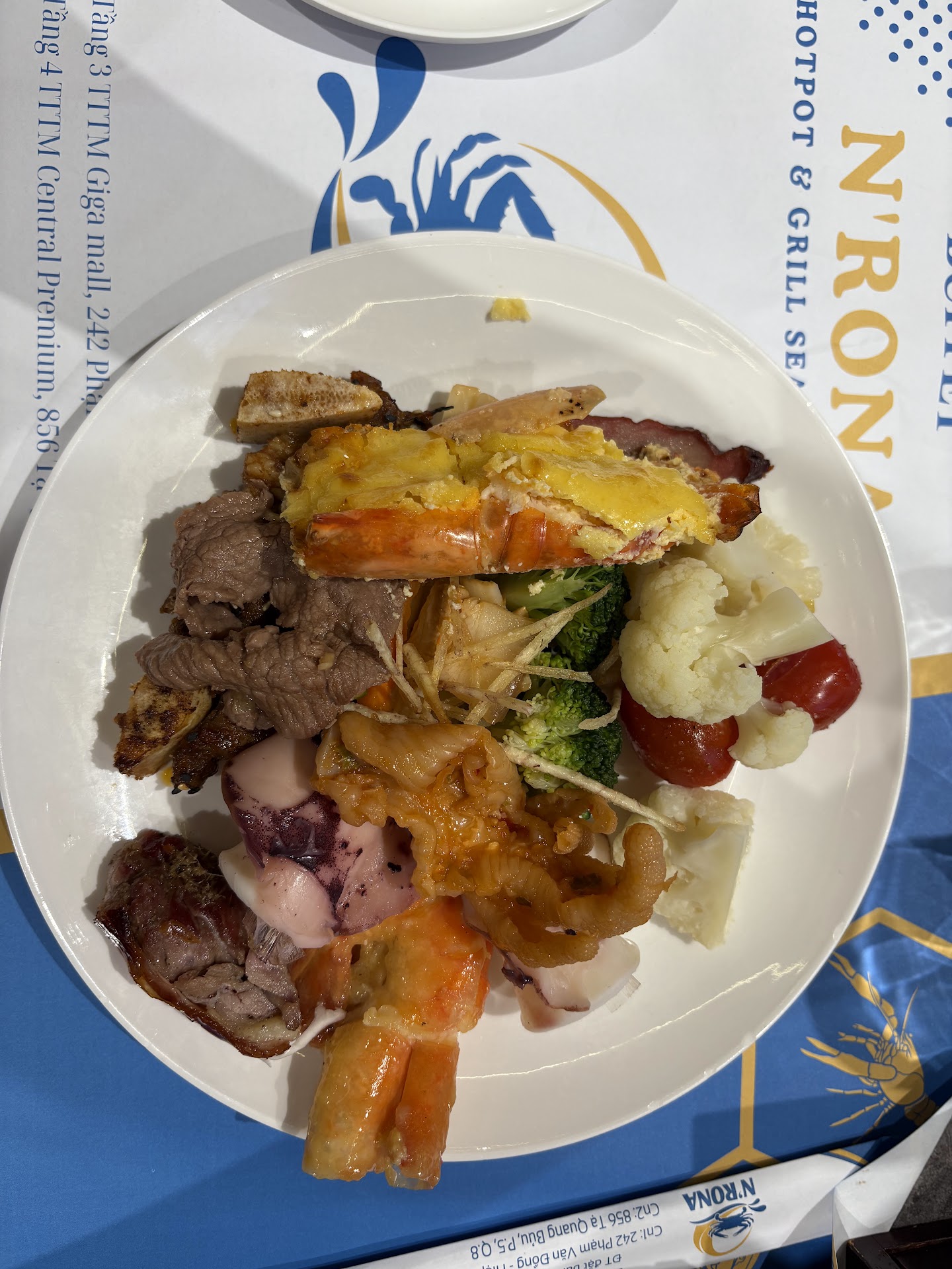 Quầy line: đồ ăn không mấy đa dạng, phải nói là so với mặt bằng chung của những buffet khác trong tầm giá thì mình đánh giá N'rona là thấp nhất. ĐỒ ĂN NGUỘI LẠNH, ĐỒ ĂN NGUỘI LẠNH, ĐỒ ĂN NGUỘI LẠNH cái gì quan trọng phải nhắc 3 lần + với việc không có bếp nướng/ hâm lại trên bàn, bếp chỉ dùng để nấu lẩu thì với mức giá này thật sự đáng thất vọng. Chỉ có những món vẫn còn ở trong nồi hấp hoặc cua ghẹ tôm hấp thì vẫn còn nóng, nhưng mỗi lần ăn tụi mình chỉ lấy 1 con ghẹ, bóc ra xong là nó nguội ngắt mặc dù bạn mình làm chưa đến 3 phút. Còn những món khác thì chỉ đựng trên dĩa ăn chứ không phải đựng trên dĩa/bếp hâm. Ốc, nhum, ... nói chung đã chế biến như nướng tiêu xanh hay phô mai thì vẫn nguội lạnh, mặc dù vẫn để trên vỉ nướng, mình đến lấy nhum cũng chờ nhum mới nướng ăn cho nóng, anh đứng bếp tự tay gấp/lựa cho mình nhưng vẫn nguội =))) Còn ốc bên phía nồi hấp thì ăn ổn, nhưng có con sò gì có 1 chút màu đỏ tụi mình ăn đều toàn cát, nói chung thì thức ăn trong nồi hấp cũng ấm hơn bên ngoài chút thôi, lấy ra chưa được 5p đã nguội rồi. Rau cũng không nhiều loại, chỉ có sà lách, bông cải xanh, tần ô, không biết còn không nhưng mình đi vòng vòng cũng chỉ thấy được nhiêu đó tráng miệng thì có chè, sâm bổ lượng, trái cây, bánh plan, yogurt, panna cotta, sữa chua nếp cẩm, kem bịch. Nhưng có những món ăn được, còn có những món ăn muỗng đầu đã sợ, kem thì mình thâý hơi rẻ tiền, như mấy cây 1 2k bán sỉ lẻ ấy. sushi: cá g ăn cũng bở bở, mình cũng kh thử mấy món sushi khác, rong nho ăn được thịt nướng có cắt, để trên vỉ nướng mà nhìn không dám ăn lúc nào mình thấy cũng còn như lúc đầu đi ngan