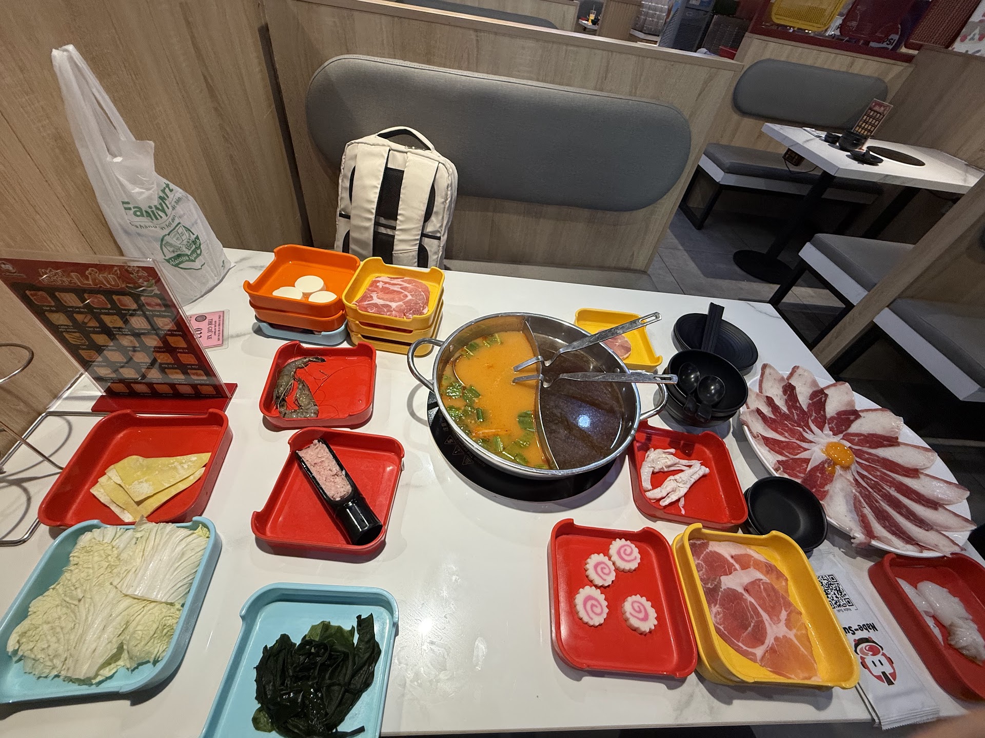 Về đồ ăn trước đồ ăn rất tươi và rất chất lượng. Thịt tươi, ngon, ngọt, không chê được chỗ nào, hải sản hơi nhỏ nhưng về độ tươi, ngon, ngọt thì như trên, không bàn cãi. Các loại viên rau các thứ còn lại đều rất đa dạng, ăn hết một vòng là cũng hơi đã đã mà không hề ngán. Các món phô mai cũng đỉnh ngon, béo vị phô mai nó real đã lắm mọi người, mọi người nên ăn các món phô mai khúc giữa cho cân bằng nha, ăn sớm quá dễ thấy đã, hong ăn thêm nổi. Miso thì thả rau, các loại viên, còn nước trong thì thả thịt sẽ là ngon nhất nha. Nước chấm thì có nước tương nhật thanh thanh nếu bạn muốn thêm chút mặn và sốt chua ngọt có mè hơi thiên chua chút xíu. Trên bàn cũng có ớt, ngò để nêm thêm. Cả hai lần mình đi đều không có cơm trắng, không biết là hết hay không có, nếu không có thì có thể bỏ khỏi menu mà. Hoành thành mình ăn cả 2 lần thì bột có hơi vị chua, mong nhà hàng cải thiện.
