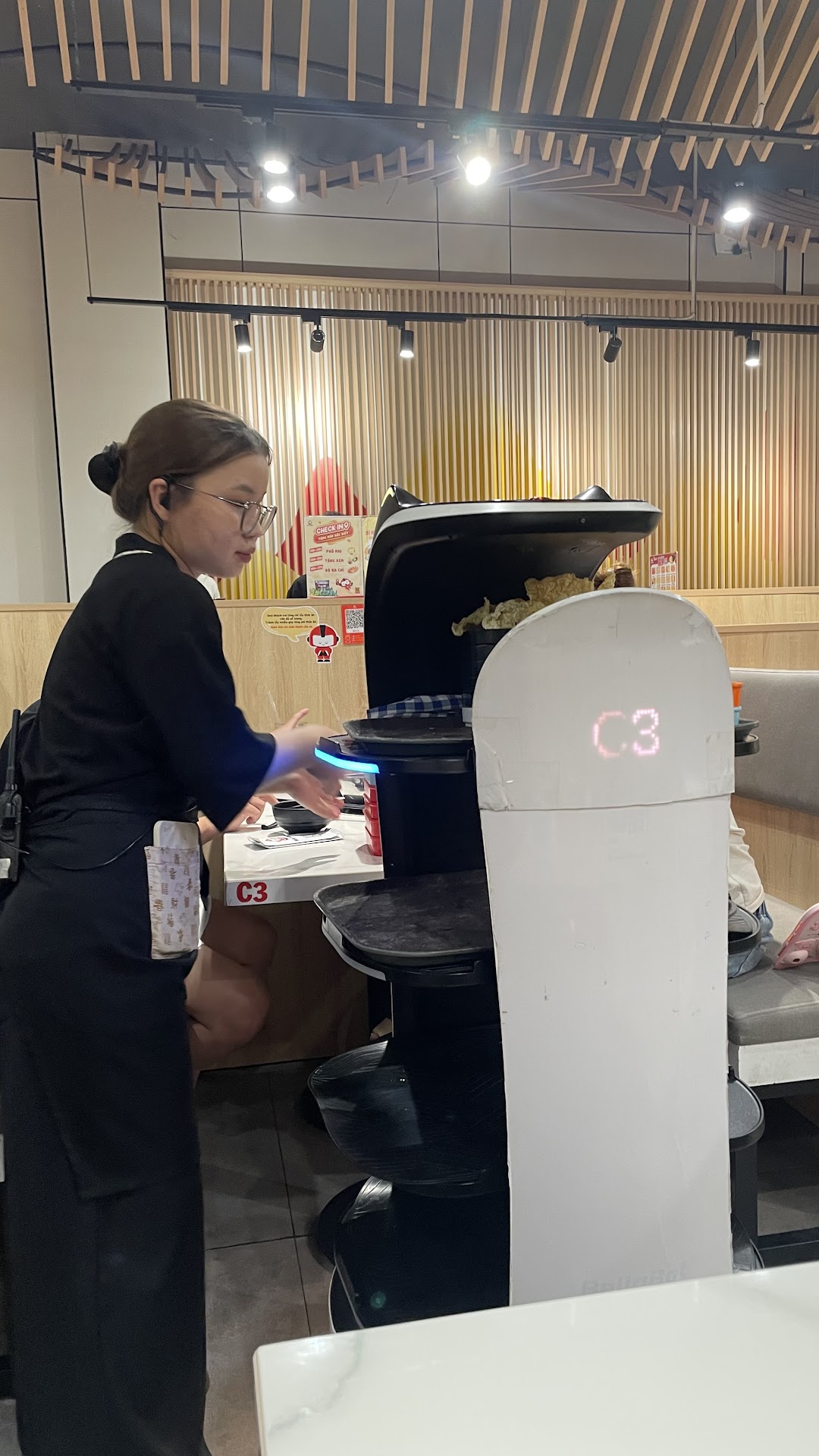 Nhà hàng có bạn robot bưng món cũng dễ thương. Mà mỗi lần bạn đi là nhạc rình rang nghe cũng vui. Các bạn nhân viên cũng vô cùng nhanh nhẹn, chu đáo. Lần đầu tiên mình đi rất thoải mái, bạn lễ tân còn hỏi mình về trải nghiệm đồ ăn nữa; hôm này mình đi một mình nên đơn giản. Còn lần hai thì trải nghiệm khá tệ. Mình được nhắc là 15' nữa hết giờ để trả bàn, nên cũng gom đồ sẵn, ngồi cho trôi trôi rồi về xong 5' sau lại có thêm một bạn ra nhắc mình còn 10' nữa nên mình lập tức đứng dậy đi về. Hôm này có bạn mình là con gái, nên mình để bạn mình ngồi một chút cho thoải mái rồi mới đi và mình đã ngừng order từ khá lâu trước đó rồi. Lần này lúc vào mình cũng đứng đợi bạn lễ tân 1 lúc lâu như không có ai. Lần thứ 2 này menu cũng có nhiều khác biệt, không còn gân bò, không còn chén phô mai và vài món nữa khá khác lần 1.