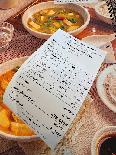 Nhà hàng khá rộng rãi, nhìn qua tưởng phục vụ sẽ chuyên nghiệp, nhưng chỉ thấy 1-2 nhân viên chạy bàn loay hoay phục vụ cả khu, nên lên món chậm, gọi thêm gì cũng phải chờ. Món ăn tương đối ổn, nêm nếm vừa miệng, không có gì đặc biệt so với giá. Nhìn hóa đơn thấy rõ: các món như Nấm Gói Lá Lốt, Hương Lạc đều gần 100k, nhưng không xứng đáng lắm với mức giá nếu so với các nhà hàng chay tầm trung khác. Điều không thể chấp nhận là nước Lavie 500ml mà tính 19.000đ. Đã thế vẫn tính VAT thêm 8%, thành ra chai nước lọc gần gấp 3 lần giá gốc. Cảm giác bị “chém” quá đà.