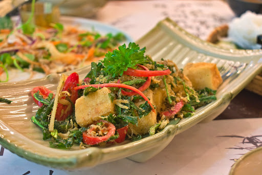 Find your inner Zen while sitting back, relaxing, and eating healthy vegetarian food. While the outer patio is decorated with pleasant foliage and a flowing lake, you'd find the most comfort in their air conditioned interior. After careful deliberation on what to eat to save room for my second lunch after this, the Fried Tofu made its impression, delicately battered and fried to a golden crisp, while maintaining a silky smooth bite that practically melts on your tongue. Each bite is packed with flavour, as it's tossed together with a Hong Kong-style salt, combining aromatics like garlic, onion and pepper into a salivating bite. Their in-house mixed salad was also a textural marvel of colourful julienned vegetables, bulked with fried oyster mushrooms and fried taro for a satisfying crunch. Dressed table-side by yours truly, the sweet and tangy sesame dressing had a pleasant nuttiness. Presented as a generous platter of Vietnamese herbs, including some rarer varieties - like tangy mango leaves - alongside unripe banana slices, starfruit, rice paper, and vermicelli. The extra-firm tofu, wrapped in toasted nori brought a gentle umami, reinforced by a tangy sriracha and fermented...