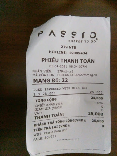 Read moreThất vọng thật sự, rõ ràng là trên fanpage ghi là chương trình cafe đá, sữa 9k sẽ áp dụng thêm đến 8/4, hôm đó mình uống cafe sữa tầm 20g30 nhưng nhân viên không cập nhật, cũng không giải thích là áp dụng cửa hàng nào, chỉ nói không biết. Complain vào fanpage thì chỉ xem không phản hồi giải thích rõ. Ly cafe 9k hay 25k không đáng nhưng cách làm việc thiếu chuyên nghiệp và thiếu trung thực. Mình uống Passio được gần 4 năm rồi, có những vấn đề đều bỏ qua được, lâu lâu ghé 279 NTB vì tiện đường nhưng nhân viên không chuyên nghiệp như những nhân viên cũ....