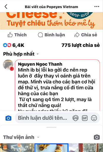 Mình ib bị lỗi ko gởi đc nên rep luôn ở đây thay vì oánh giá trên map. Mình vừa cho các bạn cơ hội để thử vị, trưa nắng cố đi tìm cửa hàng của các bạn Từ q1 sang q4 tìm 2 lượt, may là thất chứ nắng quá! Nv quầy oder thiếu kỹ năng đã đành khi KH hỏi dùng món mới, làm rõ việc khúc giữa gà và combo 3 là có sốt như nhau, thì các bạn lại lôi ngả cánh gà ra hỏi: 4-6-8 miếng...bị lắc nếu ko tỉnh sẽ chọn 4 miếng (combo là 6 miếng). Thôi ko sao Bạn oder quay hỏi quầy: có sẵn ko, nói có, báo mình đợi. Khi đó cũng hiểu các bạn đã làm sẵn hoặc vừa mới có thì ko cần chiên nóng lại lần nữa.