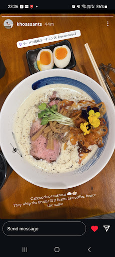 Read moreI had their signature Tonkotsu Cappucino Ramen. The gimmicky name arises from the frothy appearance & texture of the pork broth, which was actually pretty good. I requested for the seasoning to be "salty" for a heavier taste (the broth was simply more concentrated, as opposed to more salt being added). My friend ordered the Ichiban Shoyu Ramen, which I didn't like as much, but my friend enjoyed it preferred his ramen over mine. Note that this hole in the wall establishment...