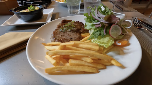 Our server, Tri, was exceptionally gracious and attentive, making our dining experience even more enjoyable. We took advantage of their happy hour with 2-for-1 drinks, opting for Cosmopolitans. For our meal, we chose the ribeye steak, served with a fresh salad and crispy French fries. The steak was tender, flavorful, and cooked to perfection. We paired it with a Terri Forti white wine, which complemented the meal beautifully.