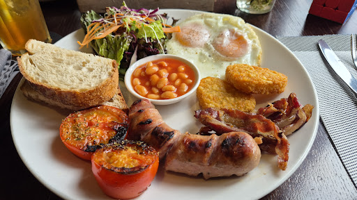 The food is decent. I usually see a piece of butter included with bread at other places, but here it’s charged separately, which was a bit unexpected. My friend and I ordered the Full English Breakfast, and on another visit I tried the grilled ribs and the eggs benedict—both were fine.