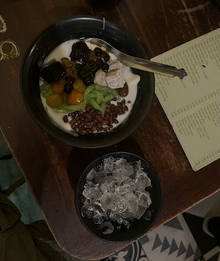 I thought each tofu dish is small, but no, they brought out a good-sized bowl of mixed tofu and a bowl of crushed ice on the side. The first bite of tofu was just the right sweetness, beautiful sense of coconut juice, and the tofu was soft and tasty. Then, I added ice, and oh boy, it was refreshingly satisfying. We ordered "tàu hũ thập cẩm, 32K VND" and "tàu hũ lá dứa sầu riêng, 40K VND." Both were very good. We ended up ordering another "tàu hũ lá dứa sầu riêng" again. This tofu place is worth visiting again.