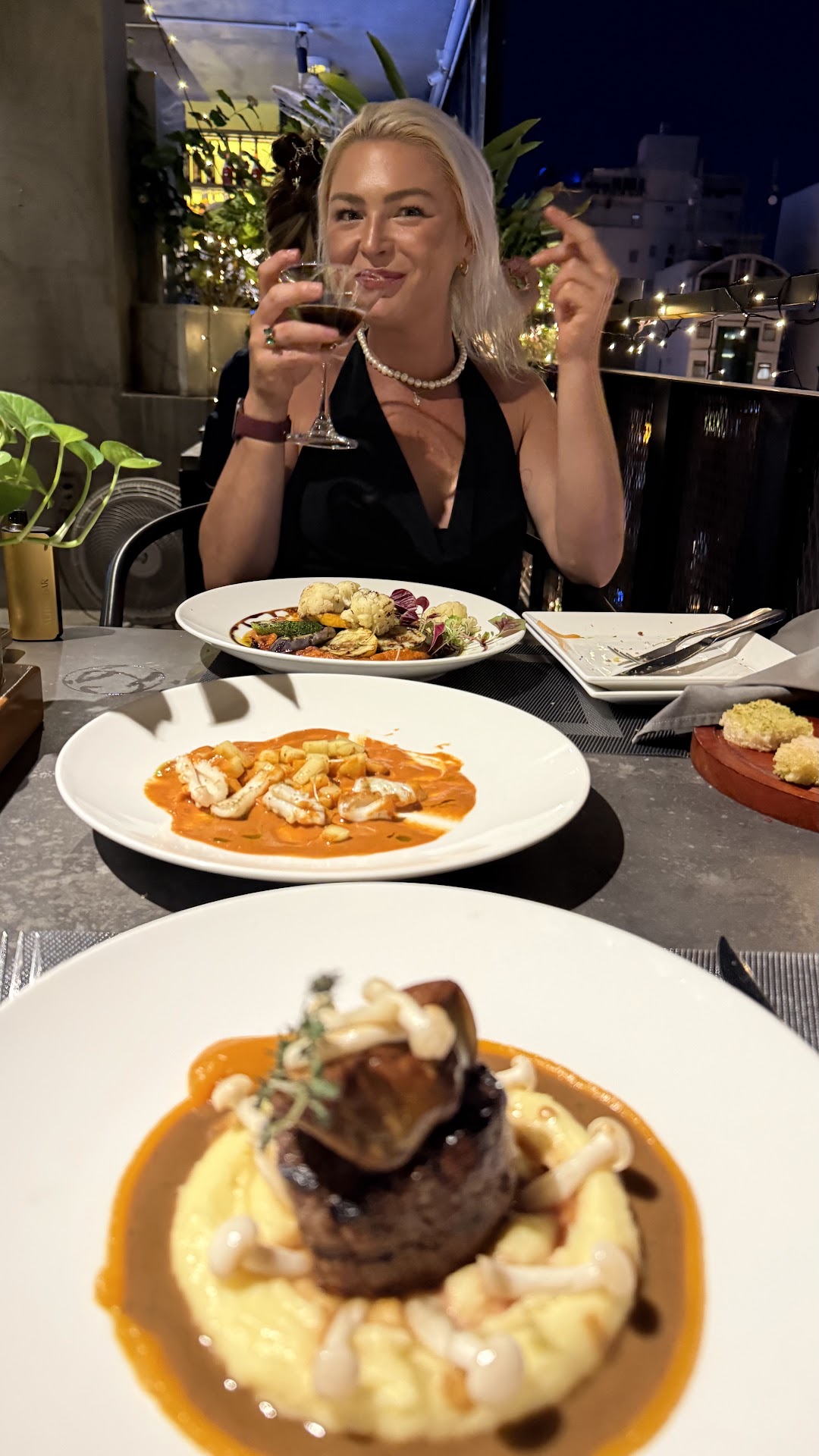 Dinner came in waves: pumpkin soup that whispered sweet nothings to the soul, salmon as slick and cool as a CIA agent in Havana, and lamb chops so perfectly seared it felt indecent. The wine was white, cold, and dangerous — it slid down too easily in the warm, sticky night. This wasn’t a meal, it was an alibi.