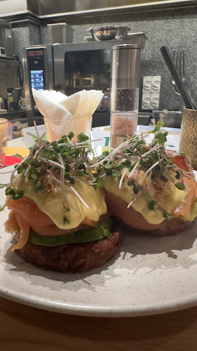 Now the main part I wanted to talk about: I ordered the smoked salmon with rosti - beautifully presented 10/10. I just wish the avocado was swapped out for some kind of greens. It would’ve been perfect with some blanched spinach or something lighter, because everything else was pretty rich: rosti, avocado, eggs benedict, hollandaise sauce. I couldn’t finish it until I ordered a side of sourdough, and that’s when I finally noticed the tangy lemon/lime flavor in the hollandaise. Before that, it was a bit too heavy to really taste the sauce properly.