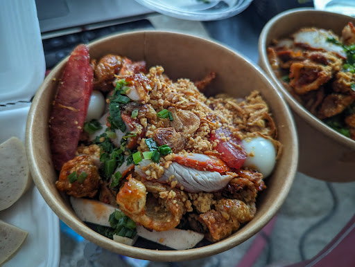 *gà xé ngon nhất, phần thịt trắng được xé sợi, đảo cho khô với sốt gia vị mặn ngọt dễ ăn (như khô gà mà mềm ẩm juicy hơn) *xá xíu ăn ổn, nạc mỡ tỷ lệ 7:3, gia vị kh đậm đà bằng gà nhưng dc cái kh bị khô *chả lụa lạp xưởng pate ăn được, kh phải hàng tuyển, lớp xá bấu tép khô giòn nhẹ, mặn ngọt dễ ăn