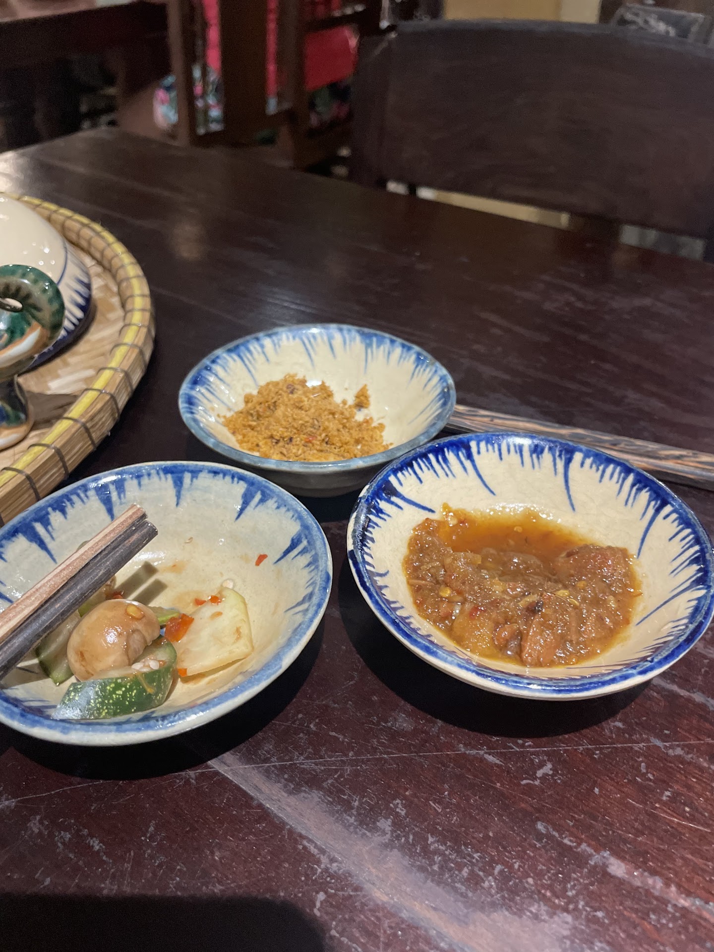 We sat on the table and asked the staff about the vegetarian menu, the waitress kindly pointed to us where we could look, plenty of options so we ordered 3 dishes. Later on, another waitress brought us 3 appetizers, I asked them if they were “chay” (vegetarian) she nodded without being super convincing. We tasted, and seemed 1 was beef and two were fish.