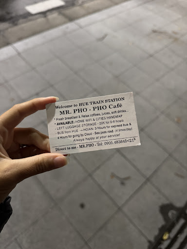 Read moreThe guy who runs this establishment (maybe Mr Pho himself?) couldn't be any nicer. Located right by the train station, he looked after our bags for a very reasonable fee while we spent a day in Hue. He checked when our train was leaving, and told us which platform / waiting room we needed to be in. He was so nice and trusting, he voluntarily lent us cash because we'd run out, and said we could pay him back when we returned at the end of the day.