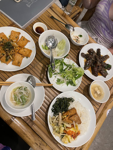 Gorgeous vegan food. We had the traditional hue noodle soup, the fried aubergine, the lemongrass and chilli tofu and the com dia and it was all 🫶🏻 atmosphere is very relaxing with the music and the bamboo growing all around you. Staff were super friendly too. Great prices too! All of that came to 125k...