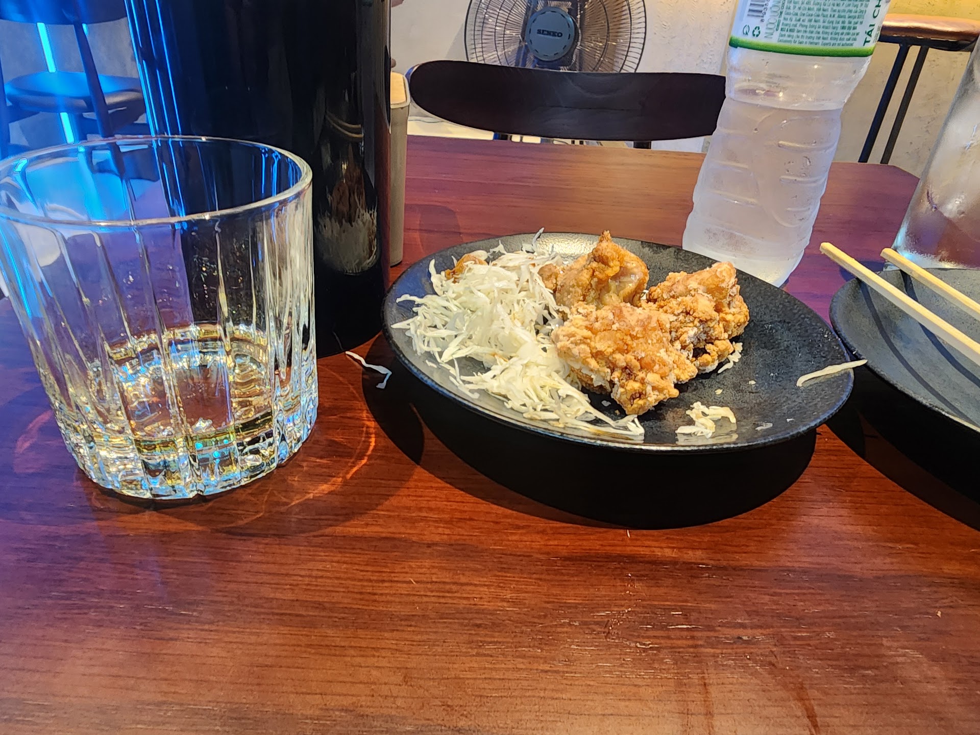 I had easily THE best chicken karaage I've ever had. Honestly, unsure how they can get the batter to be so light and thin! It's perfectly crisp and as soon as you enjoy the crisp texture, you are enjoying a juicy and tender chicken. I could tell it was freshly fried. This was accompanied by a neat glass of japanese whiskey. The chitas is a great option for about 6usd. I also had a bowl of ramen. The broth was savory with a nice smokey taste i hadn't had before. I have had 4 bowls of bun bo hue while in the area so far and this broth was easily the most hearty and potent, which should be expected due to the price. Regardless, it was not watered down at all. Due to cost-of-living here, it is understandable that most establishments don't give a lot of meat in soups and the broth may not be potent. This ramen matched its price well; egg, pork, sliced meat, and more toppings with a strong umami broth.