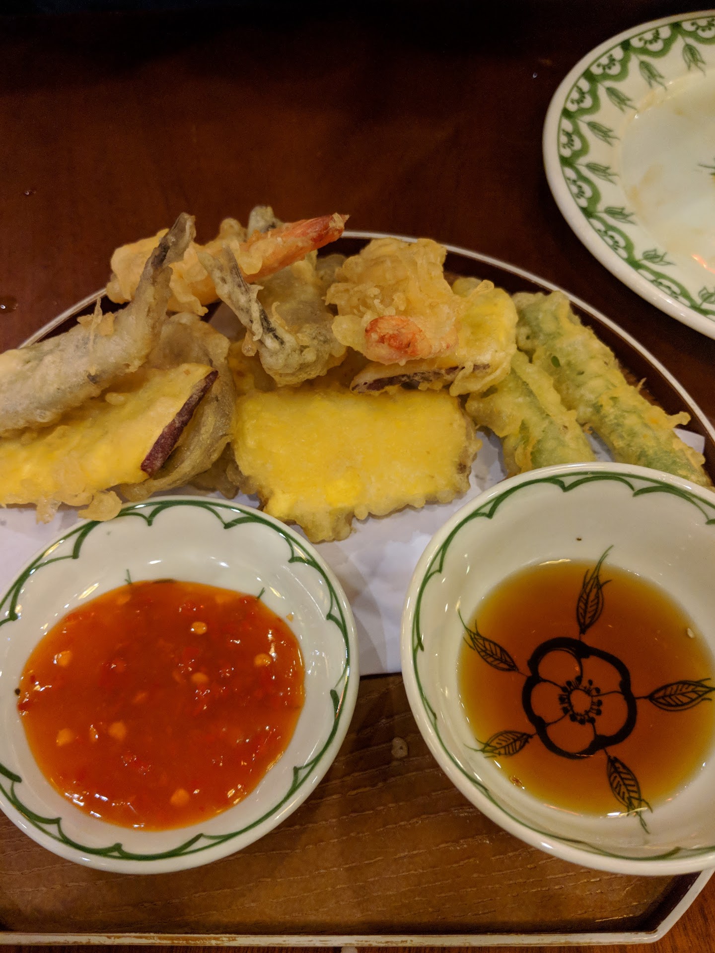 Tempura udon had quite a bit of ingredients. The staff allowed the udon to be changed to ramen. Tempura comprised of prawn, onions, sweet potato, okra, fish. Served with a side of chill rather than tempura sauce.