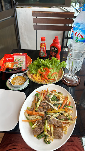 This is such an amazing cafe. When I drove past, the older man already greeted me nicely. I drove past since I was going to a different restaurant in the street, but it looked empty and this cafe looked busy and cozy. When entering I got greeted my everyone and got an amazing table upstairs for myself next to the balcony with a view over the tomb wall. This is exactly what I wanted, since I’m by myself and wanted to write in my diary and read a book. I ordered the beef rice paper meal, it’s famous in Hue and you put the food together yourself. This was so delicious!! Highly recommend. The service is immaculate and they all speak English so good and are so sweet