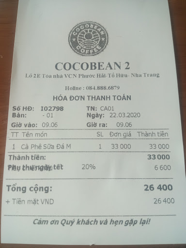 Read moreQuick service, nice coffee, modern interior, face to Alexander Yersin park then the Nha Trang sea. CocoBean (Đậu Dừa) is in the new 44 floor Mường Thanh building which is located right on the bank of Cái river and Trần Phú bridge... This Mường Thanh building's address should be No. 0, Trần Phú Avenue, because next to it is No. 2,...