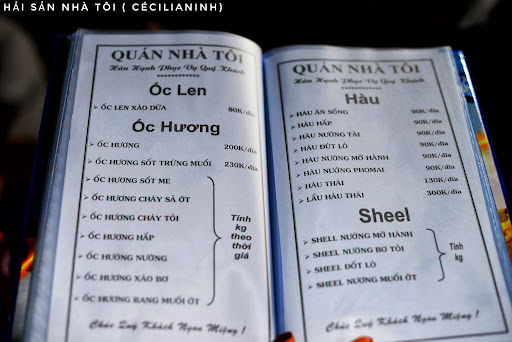 ●●●Nha Trang Review●●● Sau nhiều lần gần đây trở về Nha Trang mình có trải nghiệm kha khá nhiều nhà hàng - quán ăn địa phương hay nhiều món ăn đường phố ngay trung tâm thành phố du lịch . Mình cảm nhận một điều rằng mọi thứ tốt hơn trước rất nhiều từ cách phục vụ - thực phẩm nguyên liệu chất lượng tươi ngon và giá cả thậm chí mình thấy khá ổn rất hợp lý đi đôi với chất lượng dẫu biết rằng vị trí mặt bằng chung ngay trung tâm Tp Nha Trang rất đắt đỏ không hề rẻ. Và đây quán Hải Sản Nhà Tôi cũng là một quán hải sản địa phương nằm ngay trung tâm TP.Nha Trang với mình mọi thứ gói gọn ổn định hương vị - chất lượng và mức giá hài lòng cách phục vụ .... nếu rơi vào ngày Lễ Tết thì thôi rồi phải chấp nhận đông và chờ. ●500gr Ốc Hương Xào Me : 280.000vnd ●Lẩu Mực : 300.000vnd ●Chả Ram Hải Sản : 90.000vnd ●Tôm Đất Cháy Tỏi : 130.000vnd ●Cà Ri Cá Nóc Nhím : 250.000vnd ●Gỏi Hải Sản : 125.000vnd ●Hàu Mỡ Hành : 150.000vnd Các món đều tươi ngon chất lượng , mỗi món ăn được phục vụ khá đầy đặn - chỉ có riêng món Cà Ri Cá Nóc Nhím với mình chưa đậm đà vị Cà Ri cho lắm nhưng đánh giá cao cá dai tươi ngon . Là nơi phù hợp để ghé đến mỗi khi...