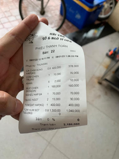 Squid. We ordered a dish off the menu which indicated VND160K per portion. Halfway through the meal, staff came over and informed that kitchen can only serve minimum of 1 kg of squid and per kg costs VND600K. What kind of nonsense is this? I decided not to buy into this and advised staff to cancel the order then. Miraculously, the dish was served up in the end as per order. However, it didn't tasted fresh at all.