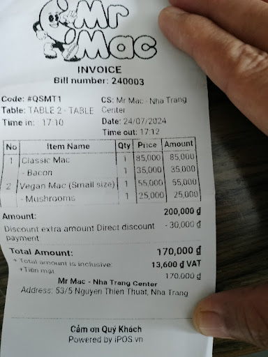 Let's do the math here: I ordered a Classic Mac (Small) but was charged 85k, plus bacon 35k, Vegan Mac for 55k, with mushrooms for 25k. Then she discount it with 30k Total bill: 170k