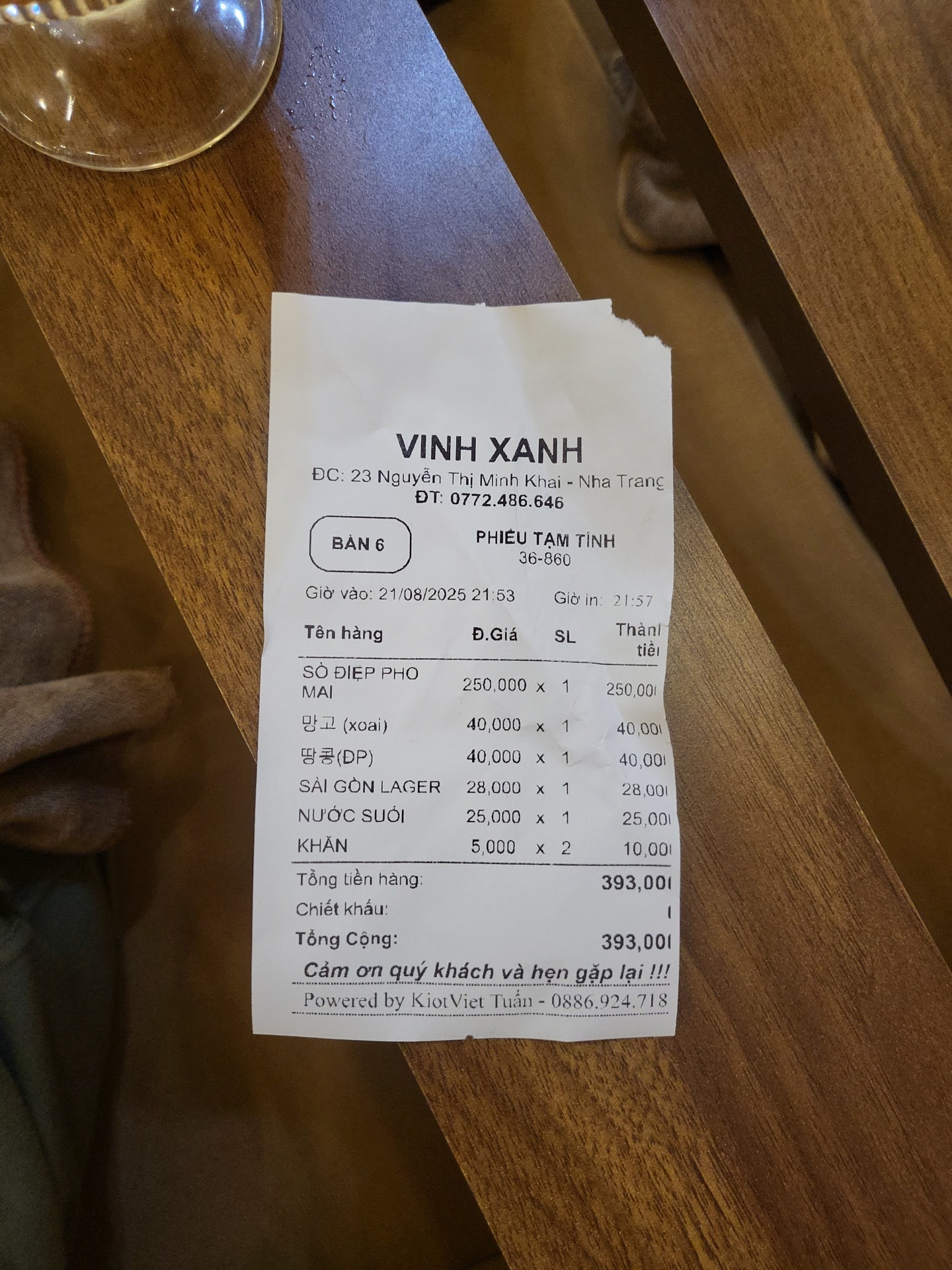 Read moreNever visit that imitation Vinh Xanh. But I don't know here is the original Vinh Xanh or not. Please see the receipt and pictures A imitation vinh xanh wasn't searched at google map. I visited the second restaurant on the way to my hotel from the beach to Regalia Gold Hotel. Never go there you must be ripped-off!!!! As you see the receipt be chared Mango and peanut. But we didn't order that. But they gave us two things mango and peanut. I knew that was the free of charge because they didn't notice that they will be charged. Yes, that was my fault I didn't check. The staff said boss make them to do. And they never modified. I argued them a little after I paid them I don't want to destroy my trip. And they smoking during cooked the food. Be careful!!!! Please visit original Vinh Xanh.!!!! And OMG they charged the...