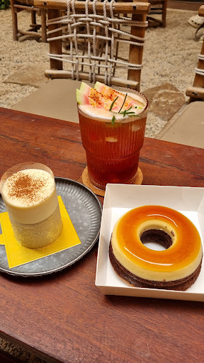 Read moreLang thang tìm quán quán bánh trên gg map thì tìm được quán này có menu nước rất hẫm dẫn mà có cả bánh ngọt Không gian rộng rãi thoáng mát, nhiều chỗ ngồi. Mọi thứ được thiết kế và bày trí rất thú vị, mô phỏng một đáy biển nhưng theo phong cách vô cùng độc đáo. Phần tường gồ ghề, với nhiều đường lượn sóng như những mỏm đá cùng sự mô phỏng các sinh vật đại dương vô cùng độc đáo và màu sắc tạo nên điểm nhấn cho không gian Về nước, với menu đa dạng, có hình ảnh cụ thể cho bạn dễ hình dung. Giá cũng trung bình không quá cao. Mình đã chọn trà ổi hồng muối ô mai. Cốc nước đầy đặn, không bị độn đá nhiều, decor xinh xắn cùng 3 miếng ổi hồng ăn rất đã miệng. Đã thử trà ổi hồng ở nhiều nơi và đa phần là vị hóa học nhưng trà ở đây khiến mình bất ngờ vì vị rất tự nhiên, hương ổi và trà rất đậm vị, kết hợp cùng chút muối ô mai, không quá nhiều nhưng cũng tăng phần đậm đà cho đồ uống Về bánh, không quá nhiều sự lựa chọn nhưng bánh nào mình thấy cũng khá hấp dẫn. Giá cũng ổn, không quá mắc. Tiramisu lava chảy khiến mình rất wow, phần trên là lớp kem mặn đậm đà, ngọt, béo nhưng không hề ngấy. Phần tiramisu hơi nhỏ nhưng vị rất tuyệt vời. Không phải chiếc tira ngon nhất mình từng ăn nhưng cũng được 8-9 điểm. Cốt bánh thấm vị mềm ẩm, cùng lớp mascapone béo ngậy. Ăn không đã ngon rồi nhưng cộng với vị hương vị của kem mặn tạo nên sự kết hợp mới mẻ Gato flan, này là kiểu gato flan mới, với lớp đường làm từ gelatin. Cá nhân mình thích gato flan truyền thống hơn. Lớp flan béo nhẹ, núng nính, kết cấu hới chắc chứ không mềm tan. Phần gato cacao cũng đậm vị, không quá ngọt. Nói chung chiếc bánh này ổn, phù hợp với người không thích ăn quá ngọt, và nên ăn 2 người chứ mình ăn 1 mình với cốc nước thấy hơi no🥴. Nước decor rất đẹp và mình mong muốn quán cải thiện về việc decor bánh khi bưng ra cho khách, 1 cái để trong hộp giấy, 1 cái để trên đế và đặt vào đĩa, đến lúc ăn nó hơi tèm lem. Tạo nên một hình ảnh mình thấy không đẹp lắm. Ngoài ra nhân viên còn quên mất order bánh của mình, phải đợi 1 lúc và mình hỏi lại nhân viên thì họ mới bưng ra Nhìn chung mọi người nên tới để trải nghiệm, nói chuyện, làm việc,... vì nước khá ngon và...