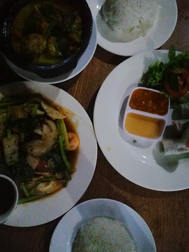В плане еды, конечно есть и плюсы и минусы. Заказали супец кисло-сладкий с морепродуктами (подаётся с рисом или лапшой на выбор, я взял с лапшой). Бодрая тарелка, на фото к сожалению только после смешивания с лапшой, вообще отдельно. Очень вкусно, заметил, что супы фо везде оч вкусные. Штучек 5 креветок и кальмаров где-то - достаточно. На деле этим модно и ограничиться)) Но мы пошли дальше. Взяли суп карри с морепродуктами и "карамелизованные креветки". Карри вкусный, как и везде, креветок с кальмарами достаточно, можно на выбор взять мясо или курицу, все основные блюда подаётся с рисом. Вкусно, но есть места, где его делают вкуснее...жирнее что ли, не знаю, тот же лантернс ,но тем не менее покушав его здесь останетесь довольным. С креветками проблема - "карамелизованные" я понял, как с жаренные со сладкой корочкой, так даже в отзывах писали, но получил просто тушёные креветоны в большом количестве лука-фу блин, ну прям вот как народ не любит лук в супа, в таком виде он тут, только ещё и сладкий, буэ! Ладно, сами креветки достойные, бульончик тоже неплохой, все испортил чёртов лук)) простите)) Когда в конце ещё чек-обманку 10% подсунули, то впечатление окончательное испортилось. Показательно, что в ресторан на улице выстраевается очередь, что после 6, думаю, попасть весьма проблематично. Народу нравится, да и мне...