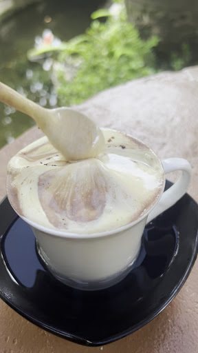 The delicious coffee is Phin brewed. If you order condensed milk it comes served on the side so you can sweeten it to your liking. They also provide a fresh milk option with sugar on the side. If you’re looking for a decadent sweet treat, try their egg cream hot chocolate! They egg coffee is also fabulous, with a nice measured sweetness.