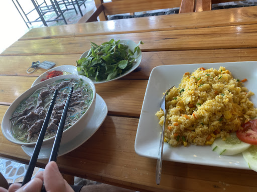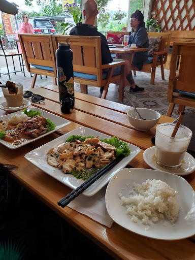 The best place in the whole area!!! Nice view to the pool and few rocks, very good atmosphere and comfortable seats inside, clean tables, the people are smiley and friendly. The coffee is good, and very fairly priced. The food is also great, especially the fried spring rolls with chicken, fried rice, pumpkin soup (incredible). We ate there at least once every day, even though we had a moto and was driving all around...we tried food and coffees in several places, but didn't find anywhere the same combination of price-value-nice atmosphere, so we're coming...