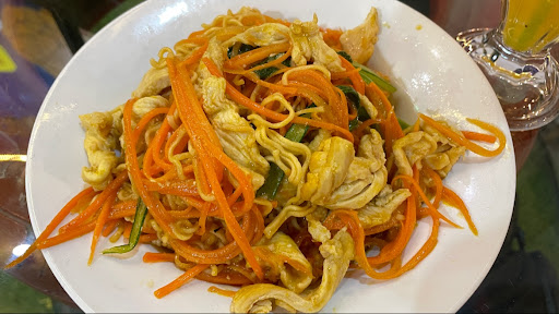 DON'T PASS BY...STOP!!! First, Rose is the most delightful woman and host with very good English if that is important to you. We had the fresh spring rolls with chicken two different times and they were excellent. My wife had the falafel burger which comes with french fries/chips. She is not a vegetarian and absolutely loved it. We had large Hanoi beers, $15k each. Every time we ate here we were treated to two bananas and a large water at the end of our meal. How awesome is that when you've been on a bicycle all day. Rose has plenty of games to play while you relax with your friends or kids. There's UNO!! Three dart boards. I can't express enough how Rose's is a special place I feel you will enjoy. There is scooter and bicycle parking here. A very clean restaurant, bathroom. You will be treated very well here. The falafel burger was $80k, the fresh spring rolls with...