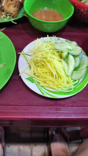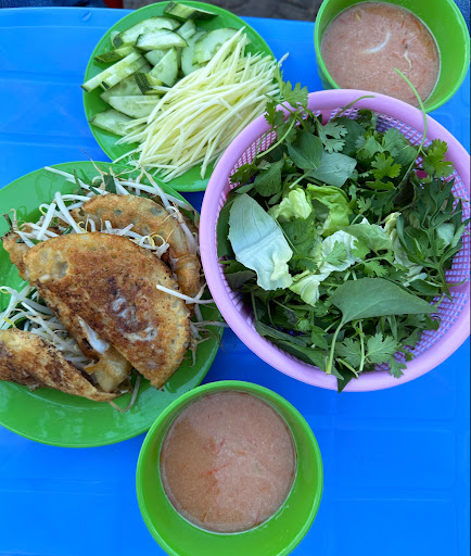 2 phần bánh xèo (~4 cái/phần, nếu mình nhớ không lầm) Bánh chiên kiểu miền Trung, giòn rụm, khá đẫm dầu Nhân có tôm – giá – thịt – mực, tươi nha Ăn kèm rổ rau sống đầy đủ, xoài bào, dưa leo Nước chấm có 3 loại, mắm chua ngọt, mắm đậu, và mắm nêm. Chị chủ bảo thường người ta mix 2/3 loại hoặc mix luôn cả 3. Mình mix mắm chua ngọt và mắm đậu ăn bắt miệng, mắm nêm ăn riêng.
