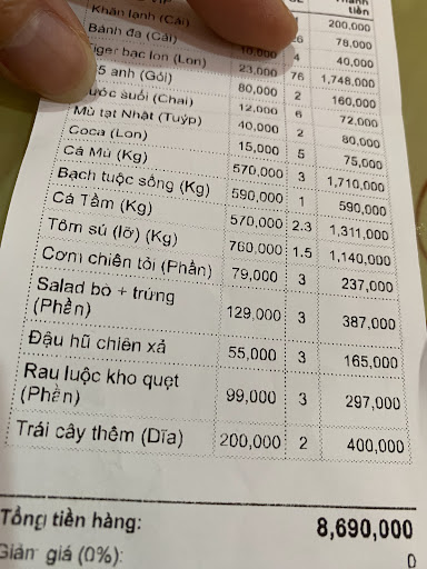 Read moreMình đánh giá 3 sao vì: Quán đồ ăn tạm, không khí và Nv, bảo vệ cũng ok. Mình vào quán là Oder đồ tươi sống và chế biến tại nhà hàng. Vậy mà mình gọi cá tầm, tuộc sống nhúng mẻ. Gọi thêm 2 con(3kg) cá mú làm sashimi+nấu cháo. Khi mang cháo lên ko mang tiêu. Gọi nv mãi mới mang. Sau tính tiền thì phụ thu 2 tuýp mù tạt 80k?? Ko lẽ gia vị quán khách phải trả tiền.Trong khi menu có món mù tạt cá mú...