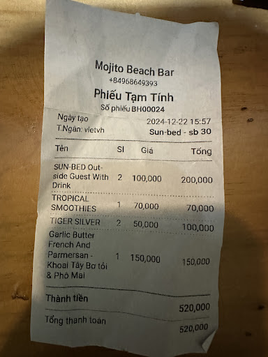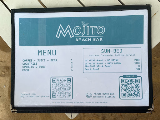 Read moreAfter walking along the beach full of chairs reserved for resorts, we were happy to find Mojito Beach Bar. Their beach chairs are 200k without a drink or 100k if you buy a drink. The pineapple juice was delicious and the French fries serving was large. The servers were friendly and didn’t seem to mind that we stayed all day. Great spot to enjoy the beach and...