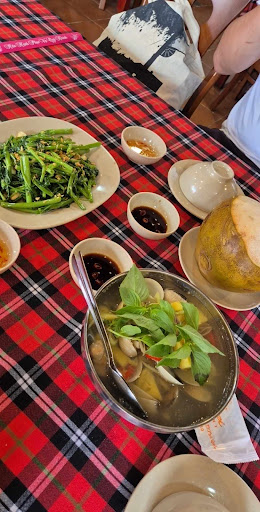 This restaurant has a relaxed and spacious setting, perfect for a casual meal with family or a group of friends. The atmosphere is comfortable with fans but could be improved if there was AC. Service was excellent – the staff were friendly and attentive, and our food arrived quickly. We ordered a selection of dishes to share, including the Canh Chua with Fish, Stir Fry Greens, and Lemongrass Pipis. The flavour profiles were generally well-balanced, though a little on the lighter side. This could easily adjusted with salt, pepper or soy sauce condiments on the table. The fish in the Canh Chua was slightly overcooked. The Stir Fry Greens, on the other hand, were cooked perfectly with a nice bite. My personal favourite dish was the Lemongrass Pipis. The flavour combination was well balanced and fragrant.