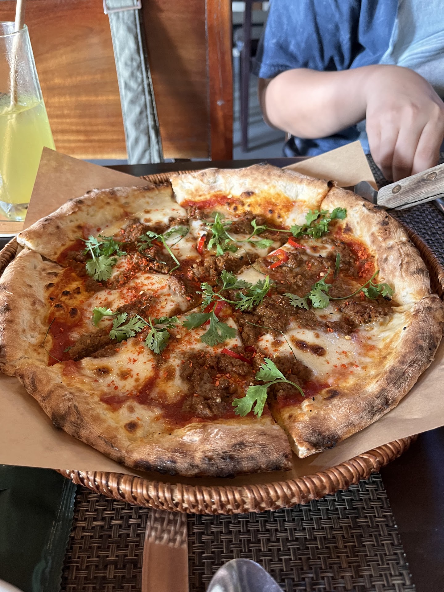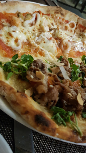 We had half seafood and half beef pizza. The seafood pizza had calamari and shrimp on it, the tomato sauce pair with it had a tiny kick to it. It's not crazy hot but you can definitely taste it. The beef pizza had marinated beef and rocket leafes on it. The crust was crispy and the bottom was a nice soft dough which I personally liked.
